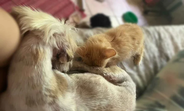 Turned 7 in December, she is a tiny female White Ocean Pearl Yorkshire Terrier. Loretta is a shy little Yorkie girl, that loves to cuddle on your lap, and feel loved and protected by her humans. She does has a skin condition that is being treated by the vet. Loretta cuddles with kittens.